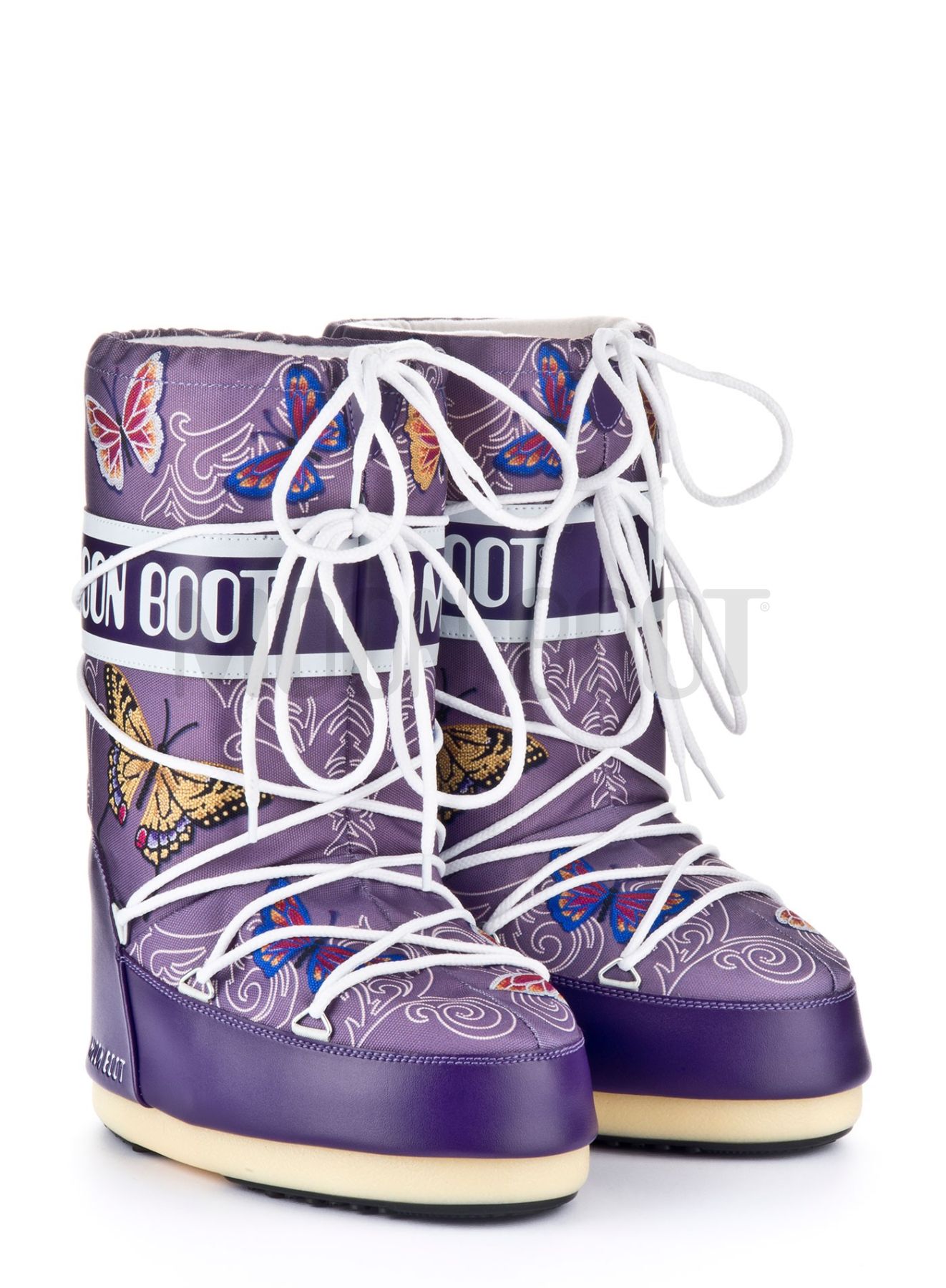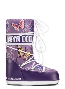 Дитячі мунбути Moon Boot JR Butterfly viola - Натхненний висадкою на Місяць 1969 року, дизайн Icon є інтерпретацією високотехнологічного спорядження астронавтів, cконструйовані за космічними технологіями Nasa ще в 70-х в Італії. Він має всі ознаки оригіналу: утеплений, оснащений легкою проміжною підошвою та має присоски на гумовій підошві, які забезпечують надійний контроль над землею. Завдяки пінообразному внутреннику Memory Foam ноги не мерзнуть при наднізьких температурах, до -35. Так як вони дуже м'які, то ідуть одразу на три розміри: 23-26, 27-30, 31-34 ітд. Після декількох одягань приймають форму вашої ноги та форму правого і лівого сапожка. Верх з текстилю.
